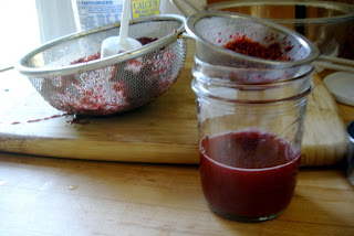 I hung battery-powered paper lanterns from the magnolia tree, and put citronella candles all around. We had smoked chicken wings that Mr. Chalmers made, potato salad with lovage, deviled eggs (our neighbor had just given us about four dozen eggs from her hens), a big apple crisp and banana bread, vodka sours and Pimm's cups, popcorn, and so on. I was especially happy with the mulberry drink the bug and I made. Just a cup of mulberry juice tinted it a beautiful deep pink, and the mulberry flavor was surprisingly pronounced—these mulberries are extremely sweet, but the acidic lemon and lime helped brighten things up:
